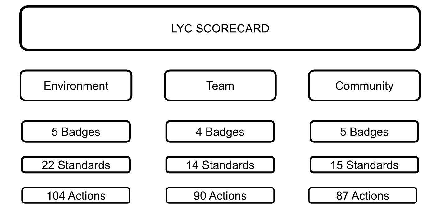 The LYC Scorecard is organized into three impact areas: Environment, Team, and Community, which are defined below. Within these impact areas are badges, earnable by meeting standards, achieved by completing defined actions.